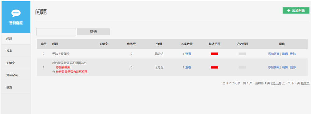 1,“問題”點擊問題菜單進入添加和編輯問題,添加問題的邏輯是,根據您自己的需求,就是將您的用戶可能會要咨詢的問題,盡可能周到一點都考慮到,并添加到問題庫里。